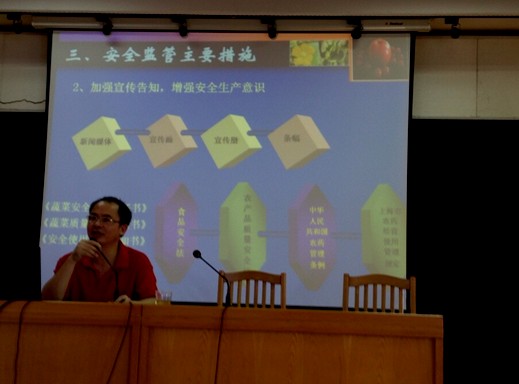 市农委蔬菜办生产条线负责人叶建平回顾了上海市蔬菜质量安全历史;对地产蔬菜目前生产现状、上海市蔬菜安全监管主要措施与存在的问题等一一作了介绍,尤其是对今后的蔬菜安全监管工作重点作了要求。市农技中心丁国强等四位老师分别讲解了《蔬菜病虫害绿色防控技术》、《蔬菜学安全使用农药》等知识。
