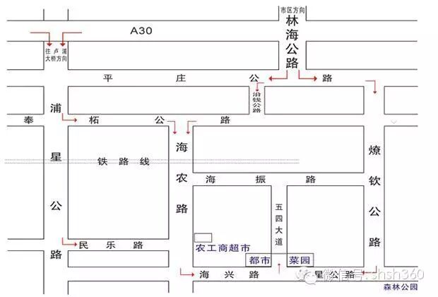 A4——A30——浦星公路——民乐路——海兴路(星火公路)。