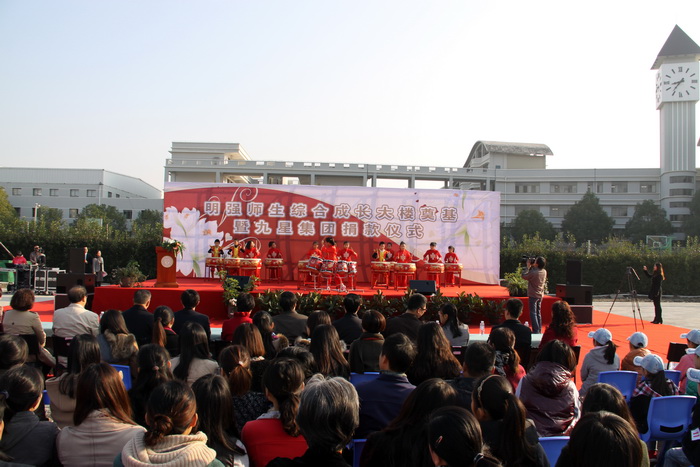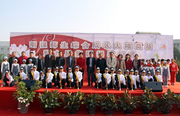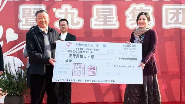 2014年11月18日上午,明强师生综合成长大楼开工奠基暨九星集团捐款仪式在上海七宝明强小学东校区举行。全国劳动模范、九星村老书记、上海九星控股(集团)有限公司董事长、上海蔬菜经济研究会名誉会长吴恩福,代表九星集团向明强小学捐款1800万元。