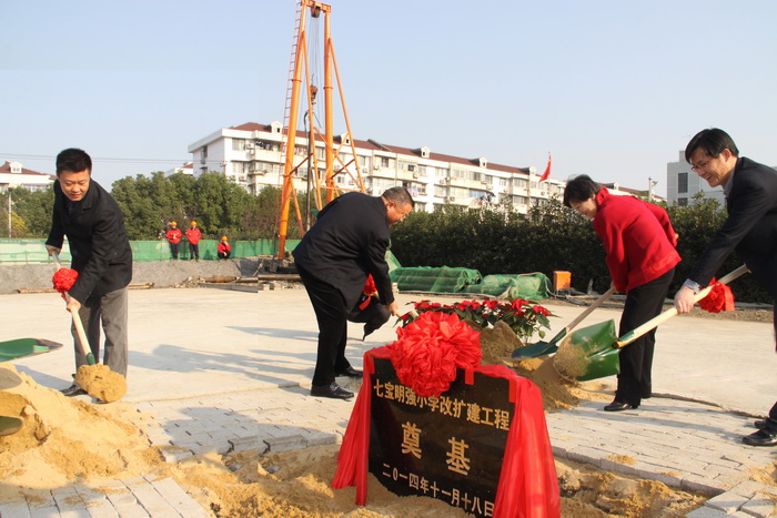 闵行区副区长杨德妹,区教育局局长王浩,七宝镇党委书记马顺华,七宝中学校长仇忠海,九星村党委书记、村委主任吴哲华等领导,以及明强小学家委会成员、师生代表200余人参加了奠基与捐款仪式。