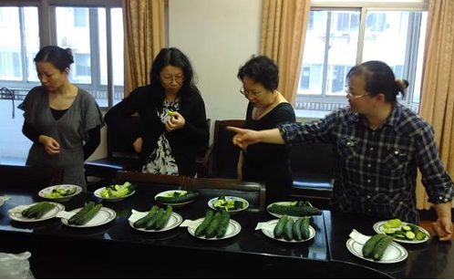 通过仔细品尝比较,大家一致认为“一休靓瓜”这个品种最甜,但口感脆度稍差,“宝科1号”黄瓜和“H1412”的甜度和脆度都很好。从外观看,“H1414”的商品性最差,其他8只品种商品性都较好。 通过大家的客观评价,技术员对“宝科1号”的前途信心大增,希望该品种能得到进一步推广。