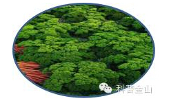 株高约30cm,基出叶簇生,深绿色,为三回羽状复叶,叶缘锯齿状,有卷曲皱缩或不卷曲而平坦的板叶形,叶柄长,绿色。生长盛期其叶腋间还可长出叶片,一株叶可多达50余片。有香气。花白色或浅绿色,细小,两性花。花梗长,先端分枝,花群生长复伞形花序。