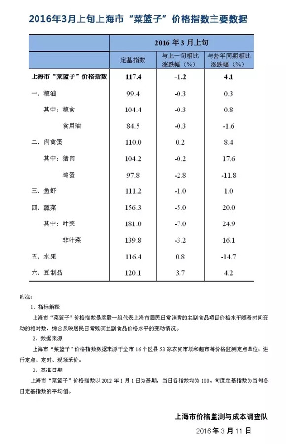 据上海市价格监测与成本调查队对全市53家农贸市场和超市采价得出的数据显示,2016年3月上旬上海市“菜篮子”价格指数环比下跌1.2%,同比上涨4.1%。