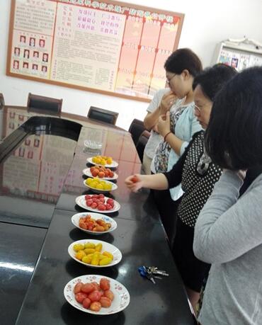 2016年6月2日,宝山区蔬菜站举行了小番茄品比会,请职工们品尝了今年引进的7只品种,黄黄红红的小番茄分门别类地摆放在桌面上,很是赏心悦目,大家都很高兴来参加这种品比会,通过观察、品尝,相互交流各自的看法,现场气氛活跃。