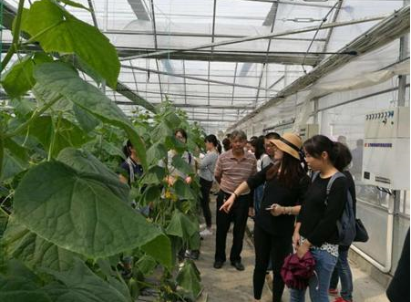 随后大家来到蔬菜大棚,实地观看黄瓜的生产现场。这里的黄瓜品种是浦东富农种业有限公司新选育的荷兰型品种碧玉5号,栽培基质是从国外进口的草炭,可以连续使用6年。大家就自己关心的产量、技术等问题纷纷向技术人员咨询。