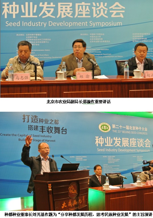 种业发展座谈会由北京种子协会任宗刚理事长主持,农业部种子管理局种业发展处处长马志强、北京市农业局副局长郑渝、北京市种子管理站站长赵山普等政府领导到会并讲话,来自全国的种业同仁200余人参加了会议。种都种业董事长刘光基作为主讲嘉宾受邀出席并在会上作了题为“分享种都发展历程,思考民族种业发展”的主旨演讲。刘光基董事长在演讲中结合种都种业的发展历程,与种业同仁分享了如何通过整合资源、打造团队、重塑品牌、创新营销等思路和模式提升企业发展的核心竞争力,并提出了在未来五年实现“在蔬菜种业届综合实力第一”的种都梦,演讲得到了与会领导和种业同仁的高度赞赏,赢得了全场热烈的掌声。