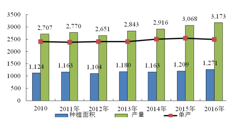 (蓝色为种植面积,绿色为总产量,折线图为单产)
