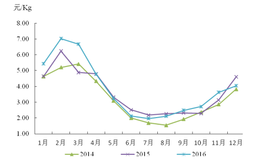 受种植与上市季节性规律影响,茄子年内价格一般呈现“V”型波动。2016年年初茄子价格大幅上涨,带动价格总体水平明显上升,全年平均批发价格达到每公斤3.85元,为2009年以来最高值,同比上涨7.0%。2016年茄子年内月度间价格极差达到每公斤5.1元,标准差达到每公斤1.7元,均为近5年来最大值,波动幅度有所加强。