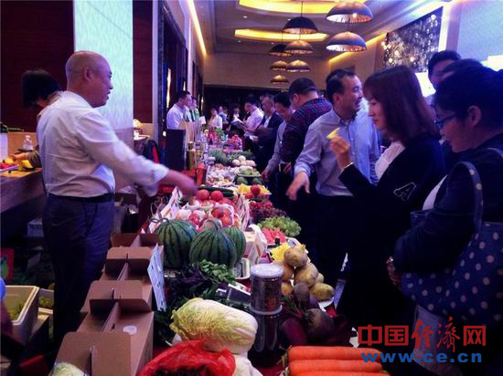 在徐州·上海蔬菜外延基地建设专题恳谈会上展示的徐州蔬菜优质产区的番茄、黄瓜、辣椒、茄子、土豆等蔬菜。中国经济网记者 沈则瑾摄
