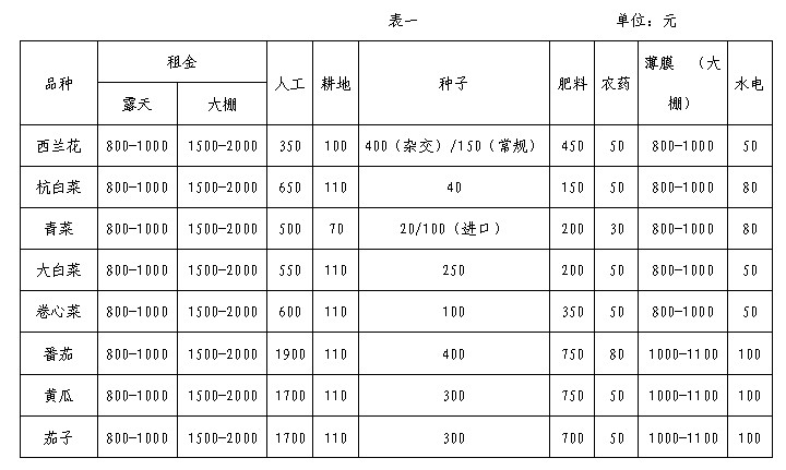 注:上述表格土地租金、薄膜成本为一年每亩的价格,其他数据为每茬蔬菜所需的成本。