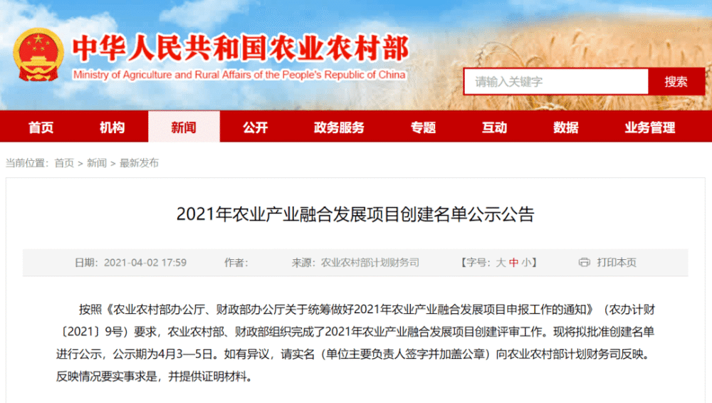 近日,农业农村部办公厅、财政部办公厅联合公布2021年农业产业融合发展项目建设入选名单。其中,甘肃9个农业强镇入选,1个现代农业产业园入选,2个优势特色产业集群入选。此次创建将为全省农业产业发展,推动农村一二三产业融合发展,促进农业高质高效、乡村宜居宜业、农民富裕富足发挥重要的示范引领作用。