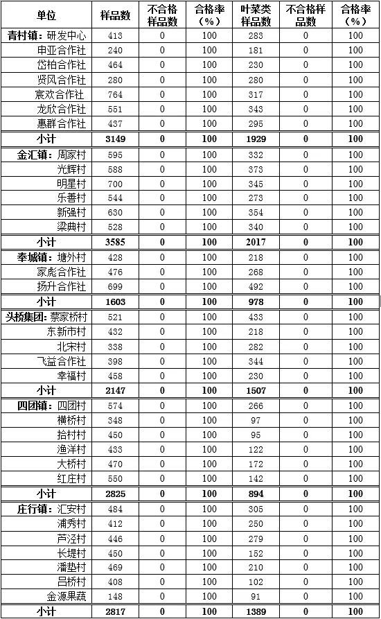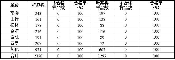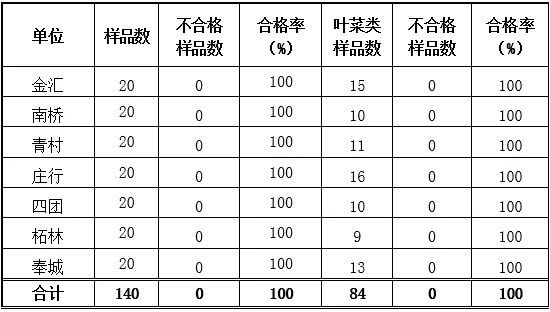 2021年6月,奉贤区食品安全监管部门共抽检检测蔬菜样品22565份,合格率100%。